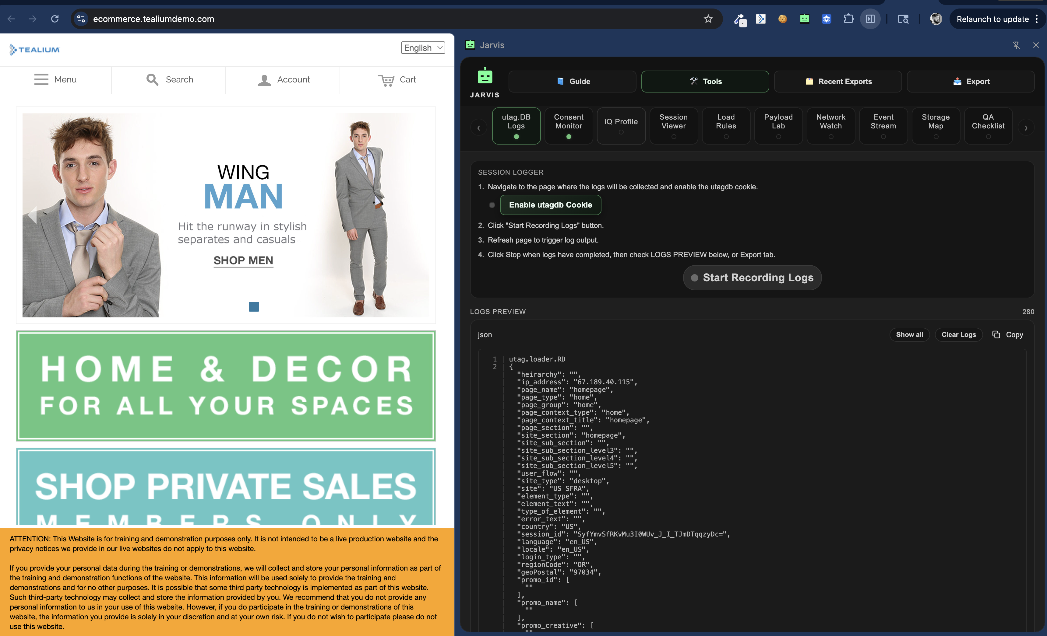 - Storage map snapshots (cookies, local/session storage, utag data).